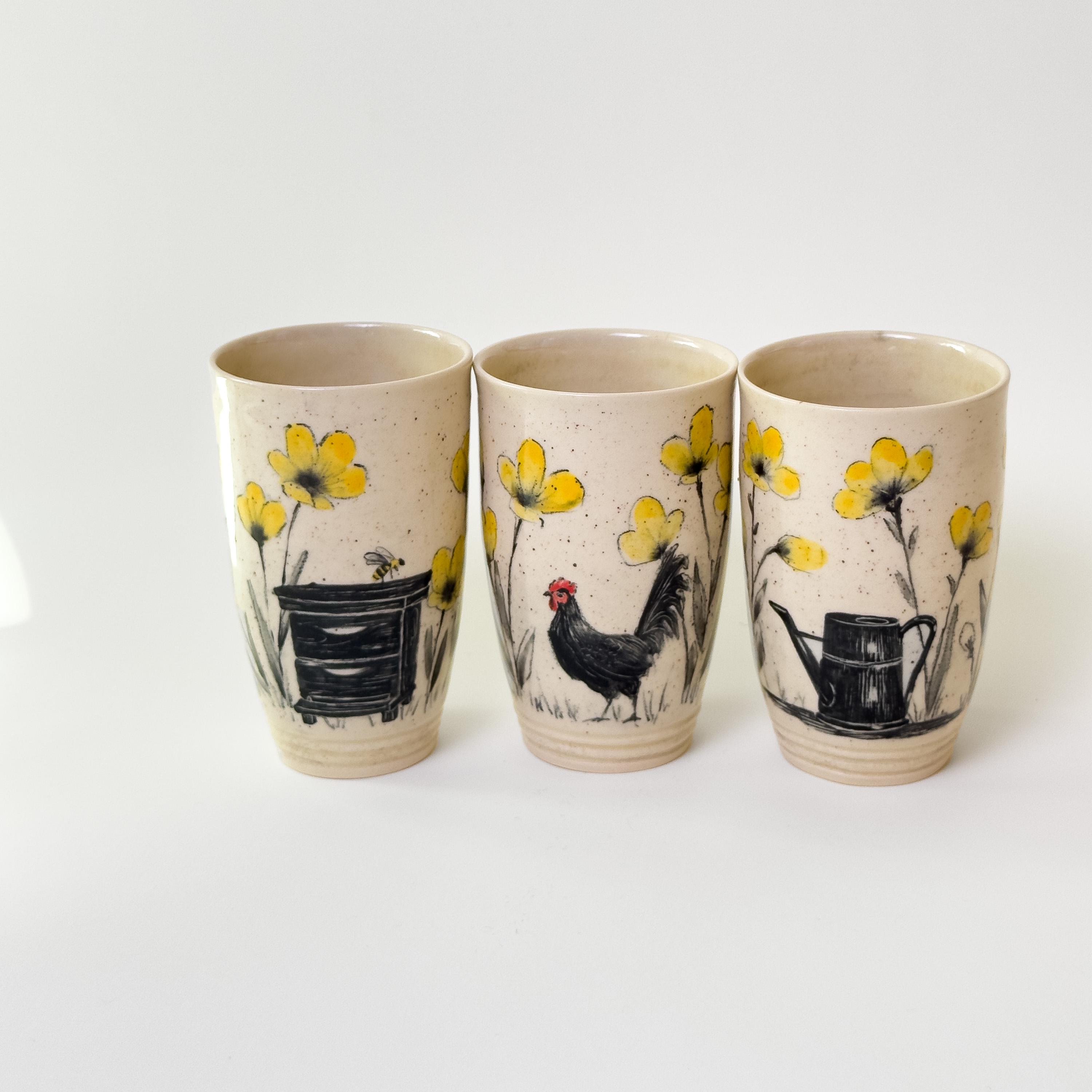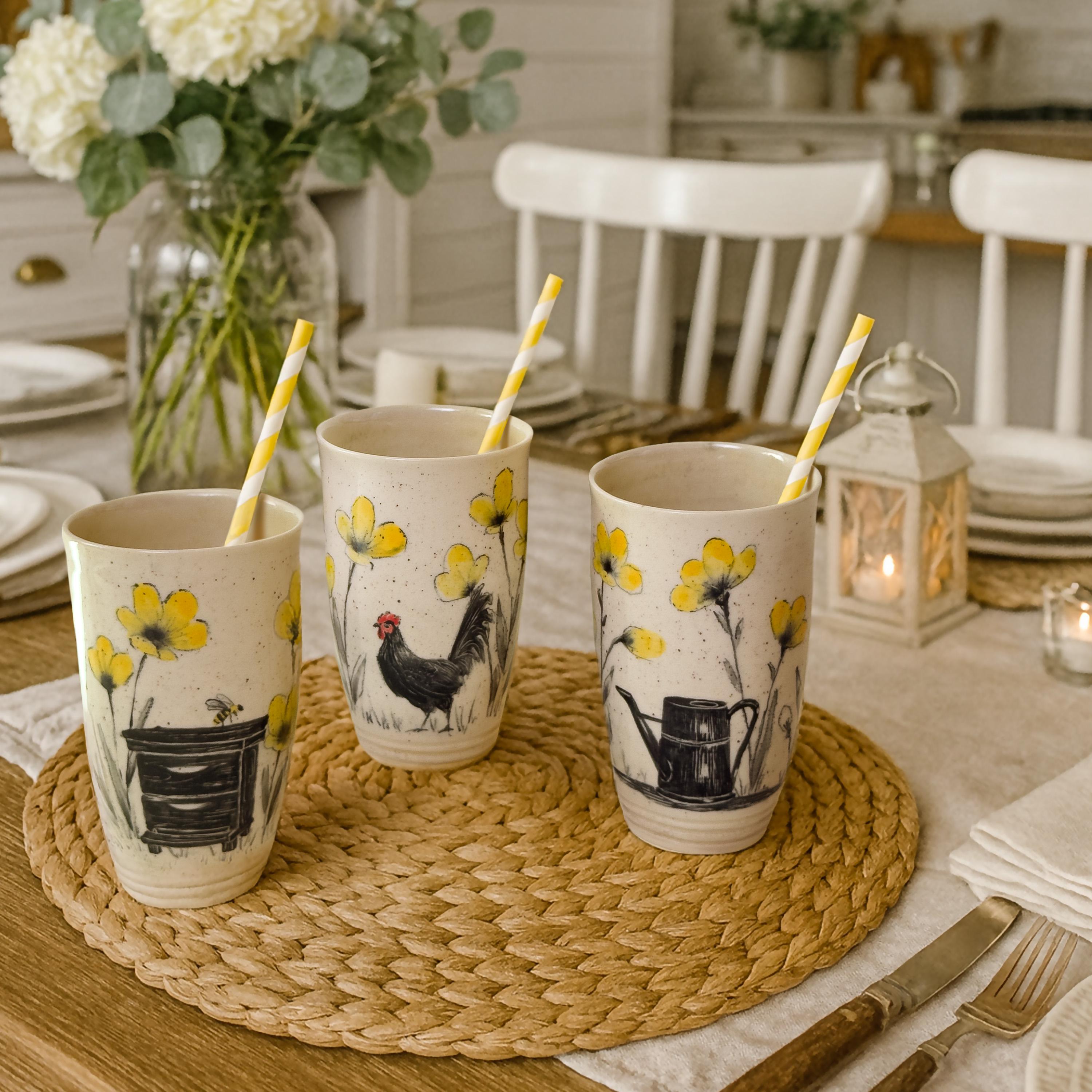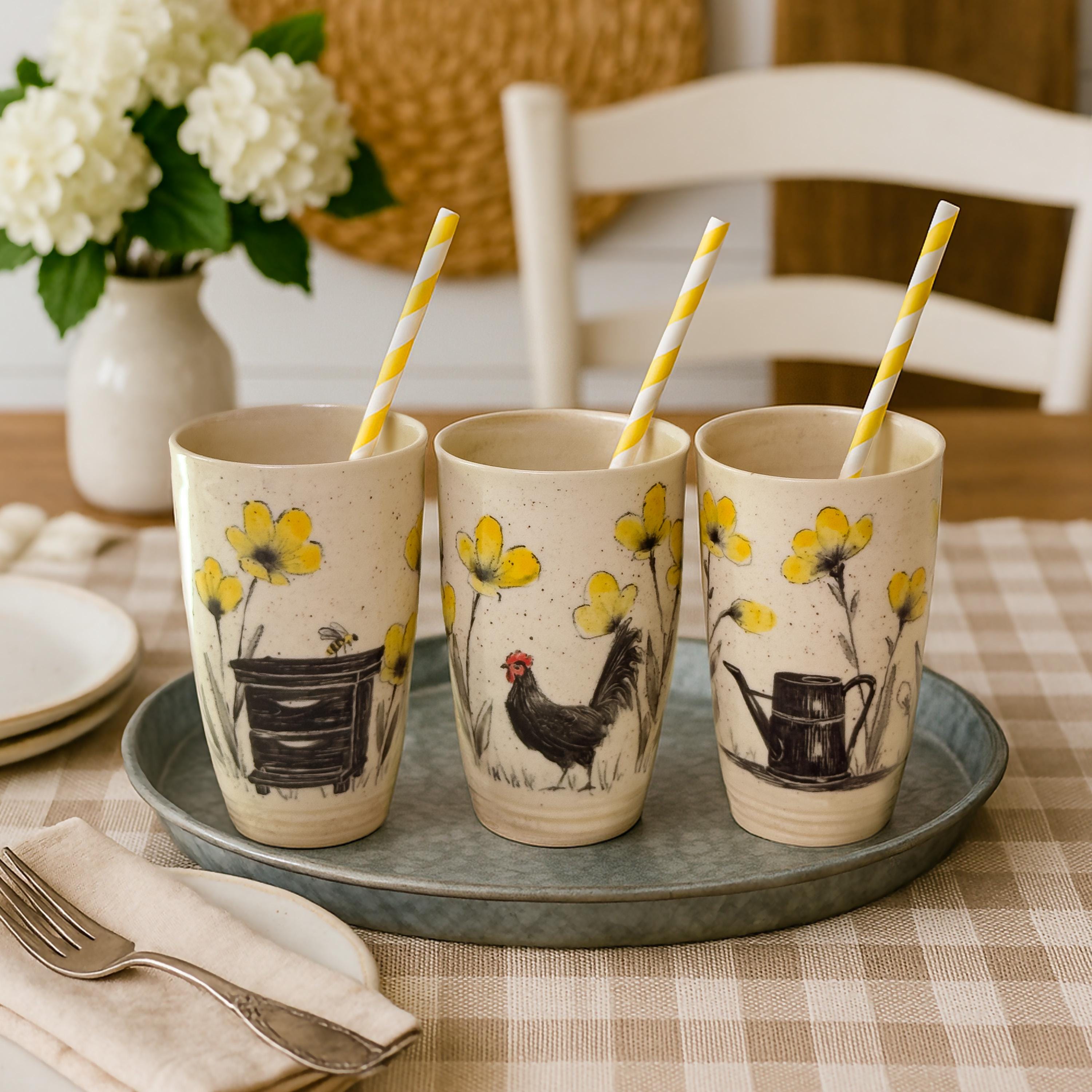 Bring cozy farmhouse charm to your table with this of lead-free, hand-painted ceramic tumblers. Each cup features a unique rustic illustration — a rooster, a beehive, and a watering can — surrounded by cheerful yellow flowers. Perfect for your morning juice, iced coffee, or tea, these tall pottery cups are both functional and decorative. Their creamy speckled glaze and warm handmade texture make them ideal for farmhouse, cottage, or country-style interiors.