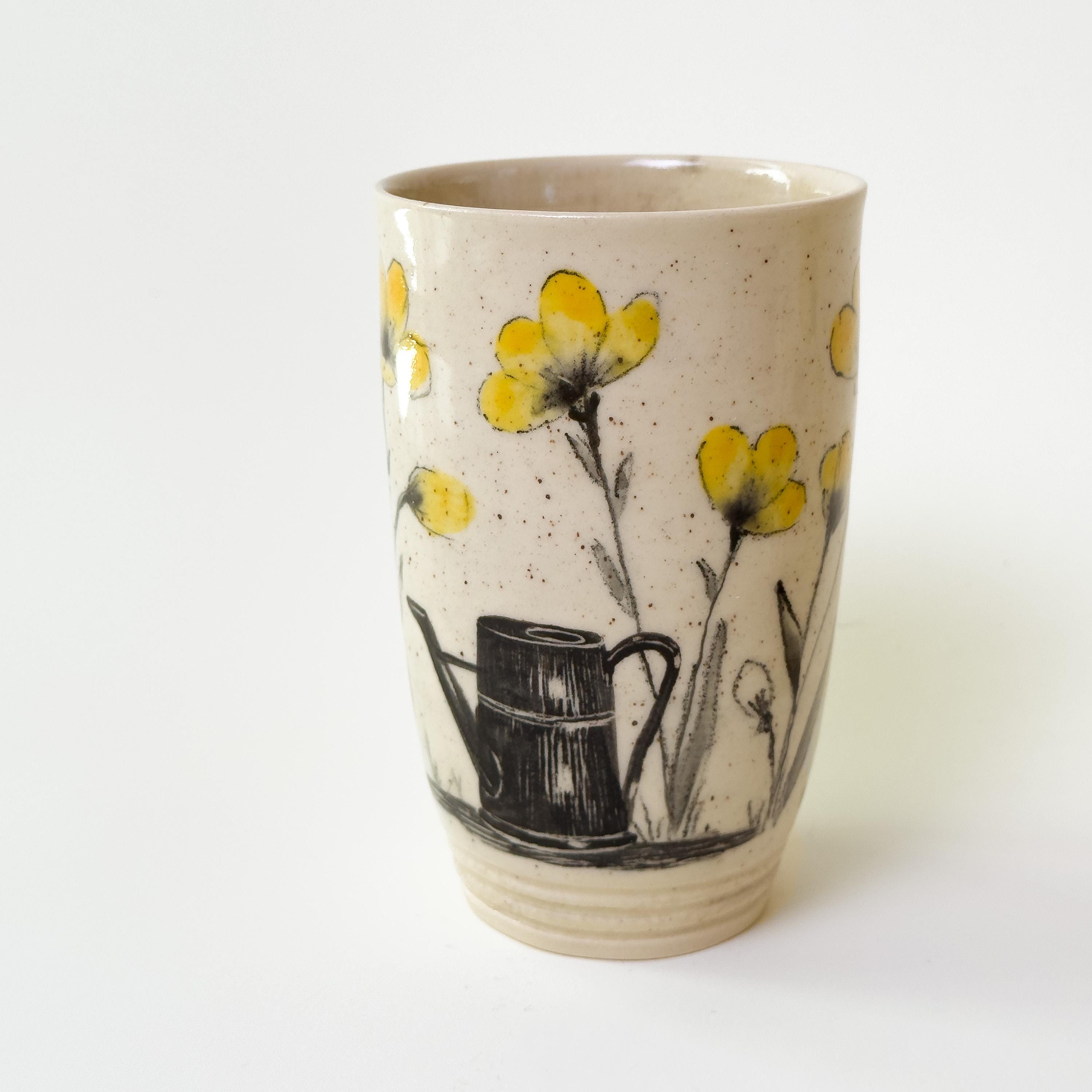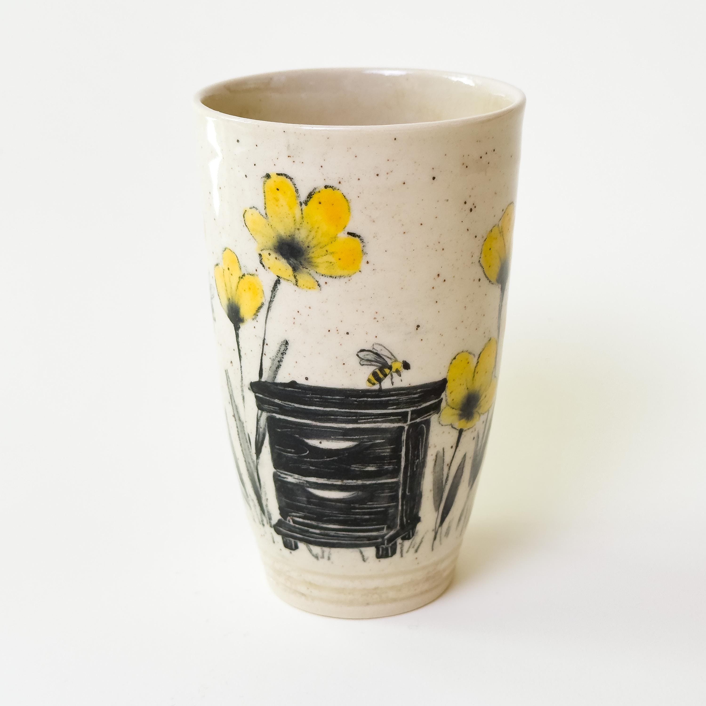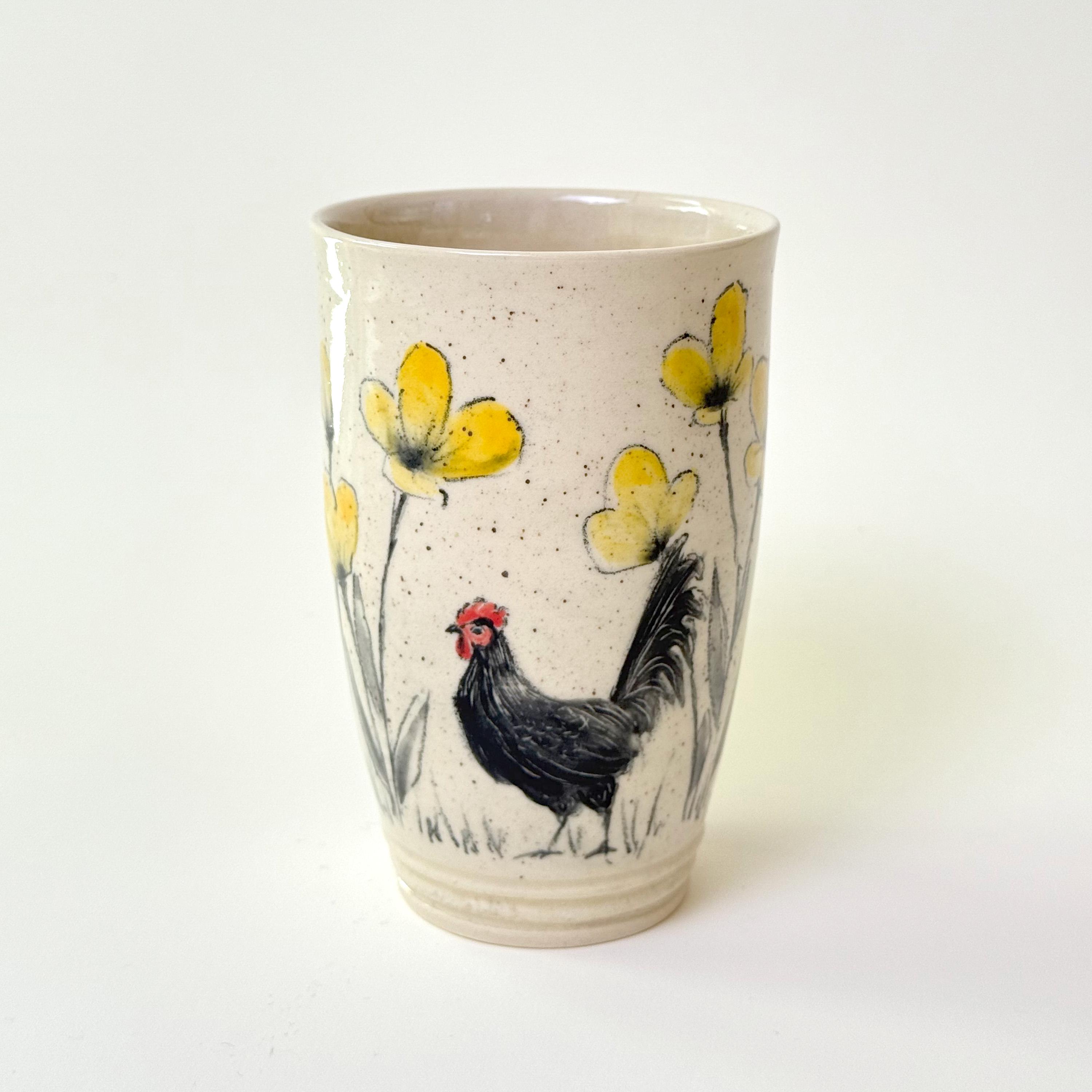 Bring cozy farmhouse charm to your table with this of lead-free, hand-painted ceramic tumblers. Each cup features a unique rustic illustration — a rooster, a beehive, and a watering can — surrounded by cheerful yellow flowers. Perfect for your morning juice, iced coffee, or tea, these tall pottery cups are both functional and decorative. Their creamy speckled glaze and warm handmade texture make them ideal for farmhouse, cottage, or country-style interiors.