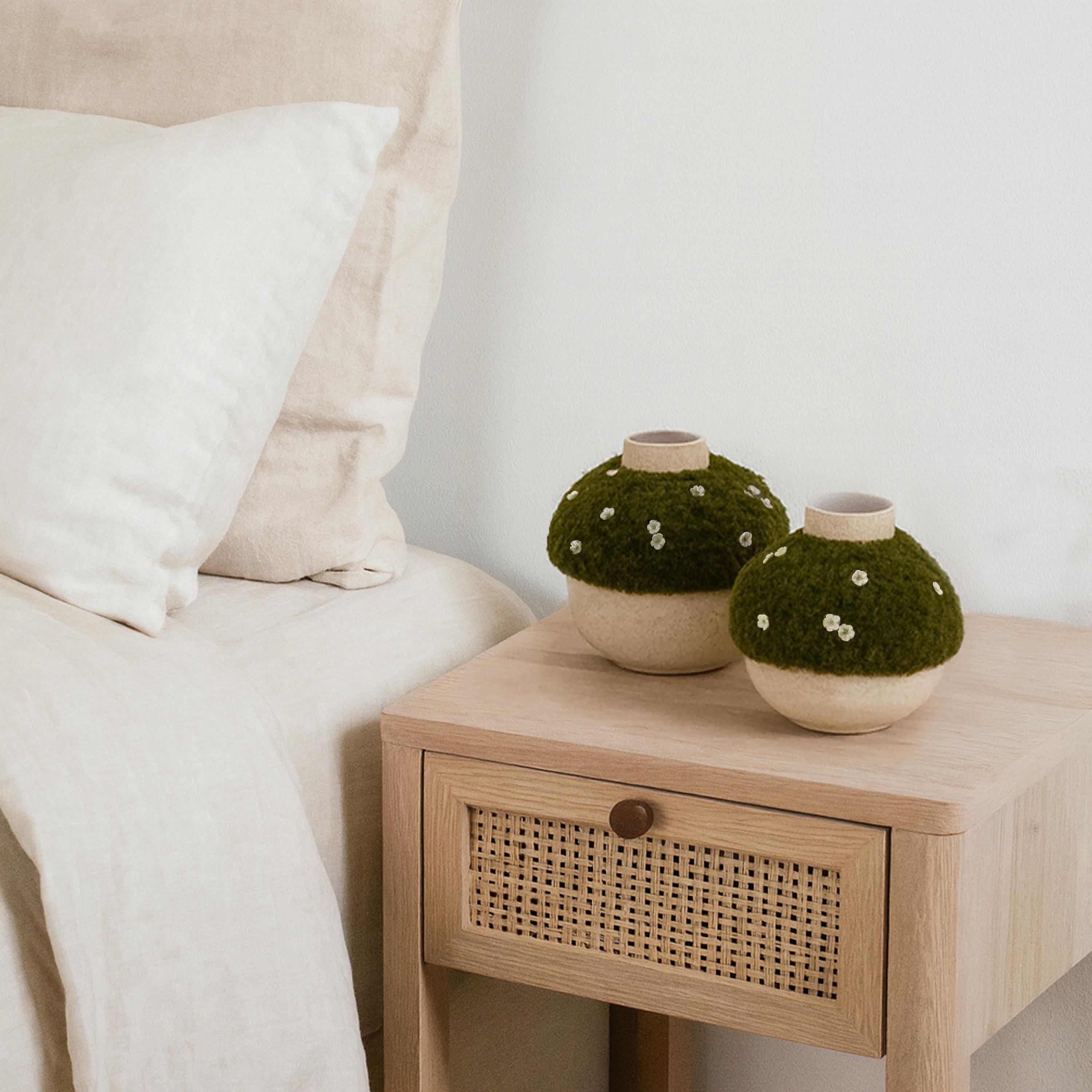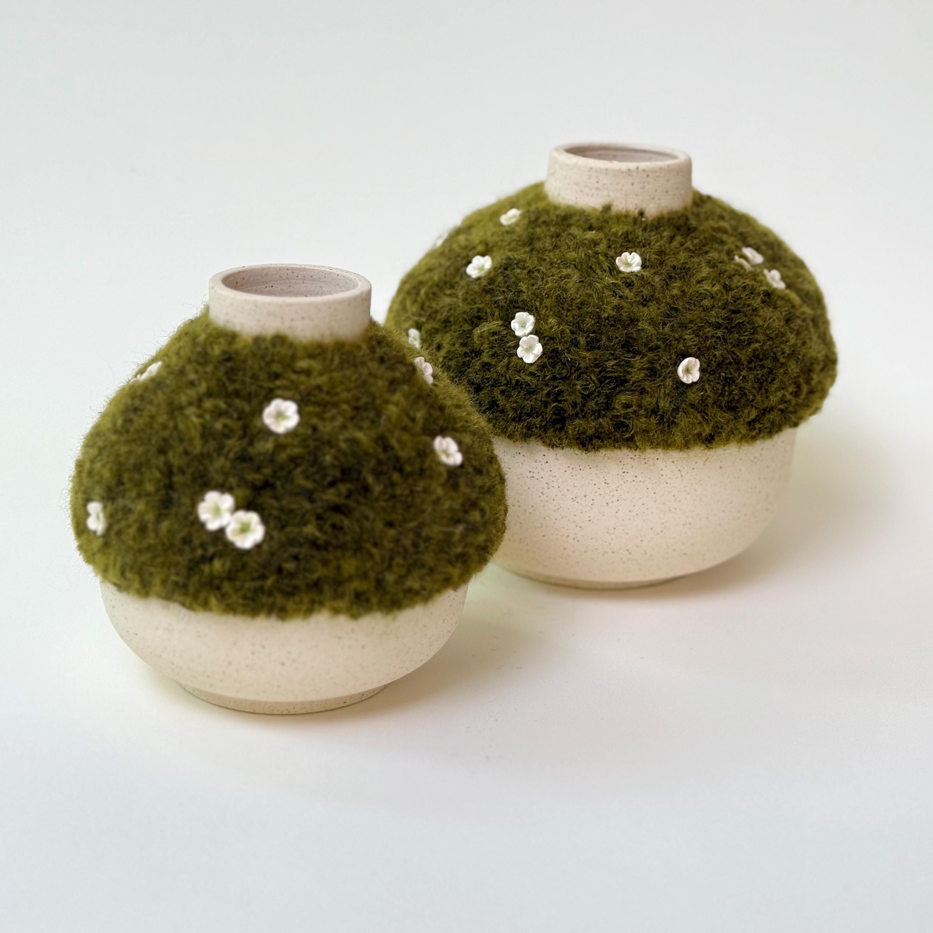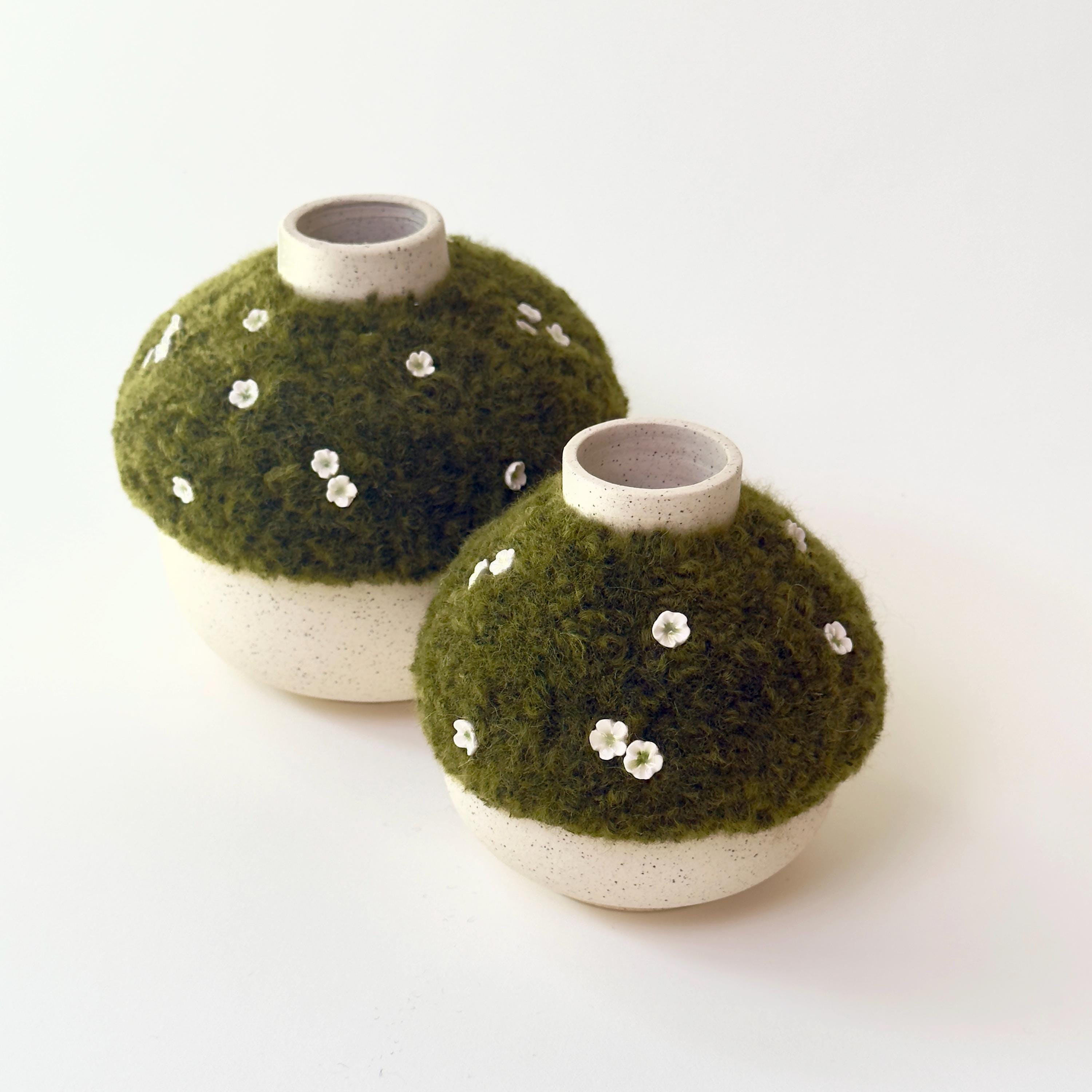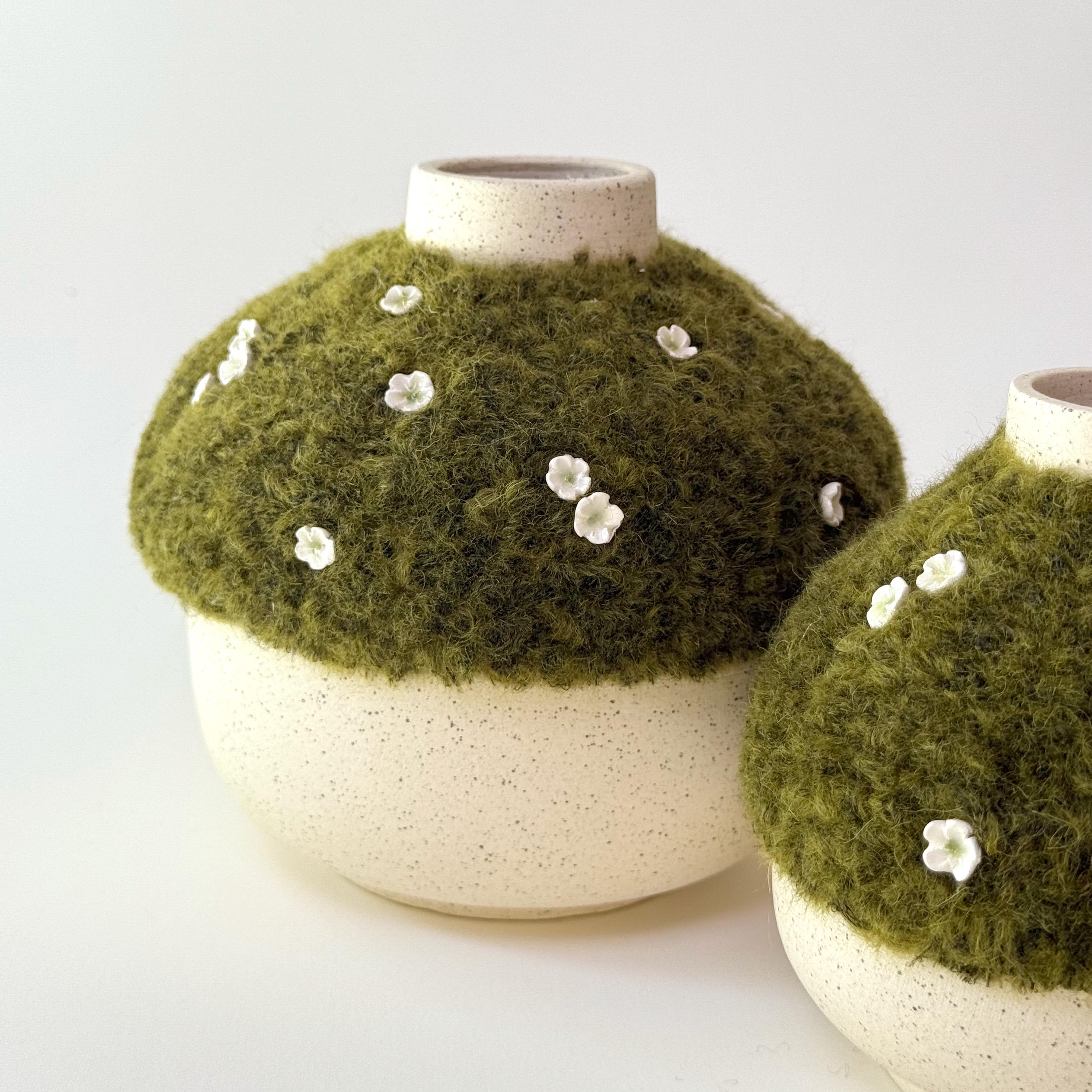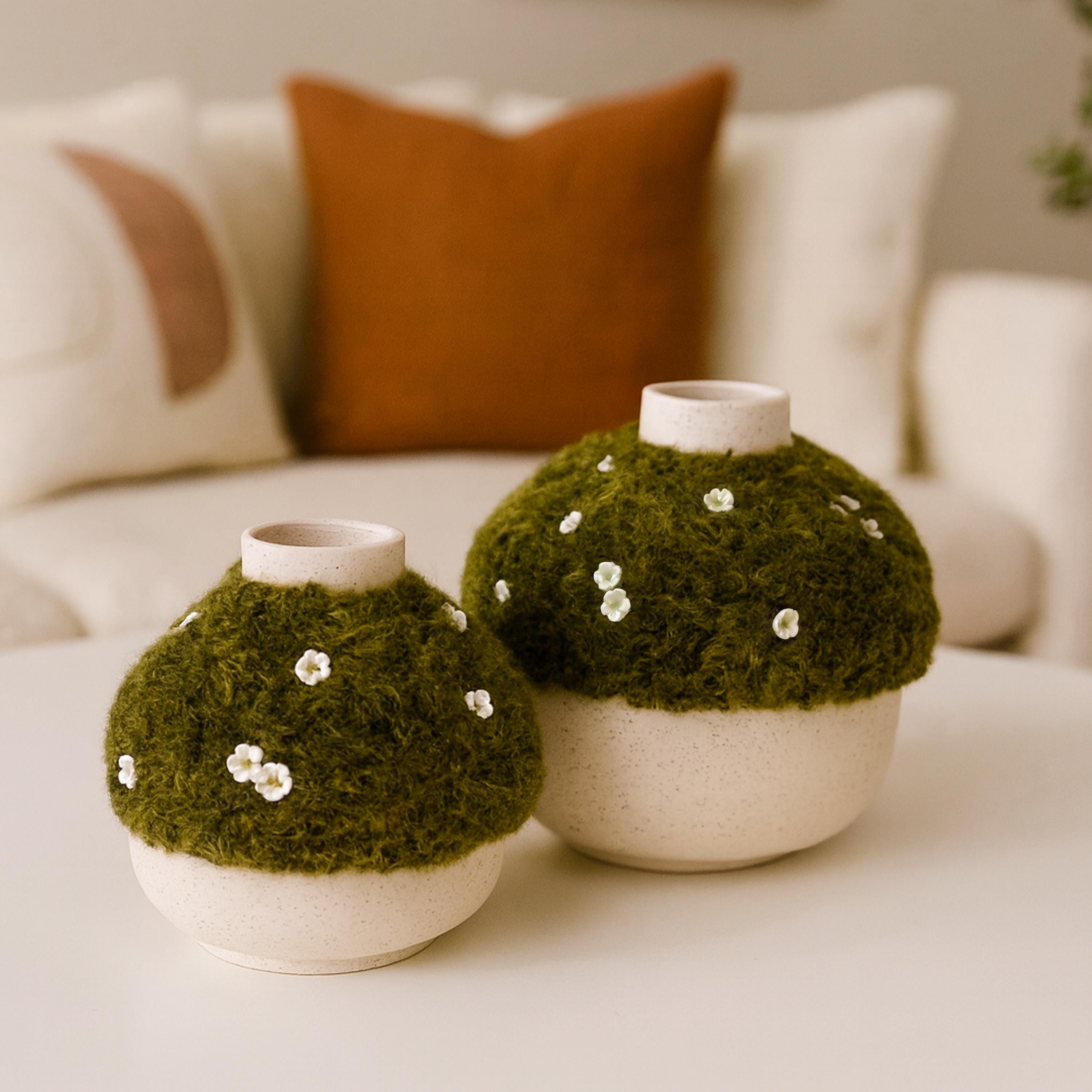 Bring a little forest poetry to your shelf. Each vase is wheel-formed in durable stoneware, then dressed in a soft wool “moss” wrap and finished with tiny hand-made porcelain blossoms. The contrast of tactile green wool and matte, speckled ceramic makes these pieces read like living art—calm, sculptural, and irresistibly touchable.