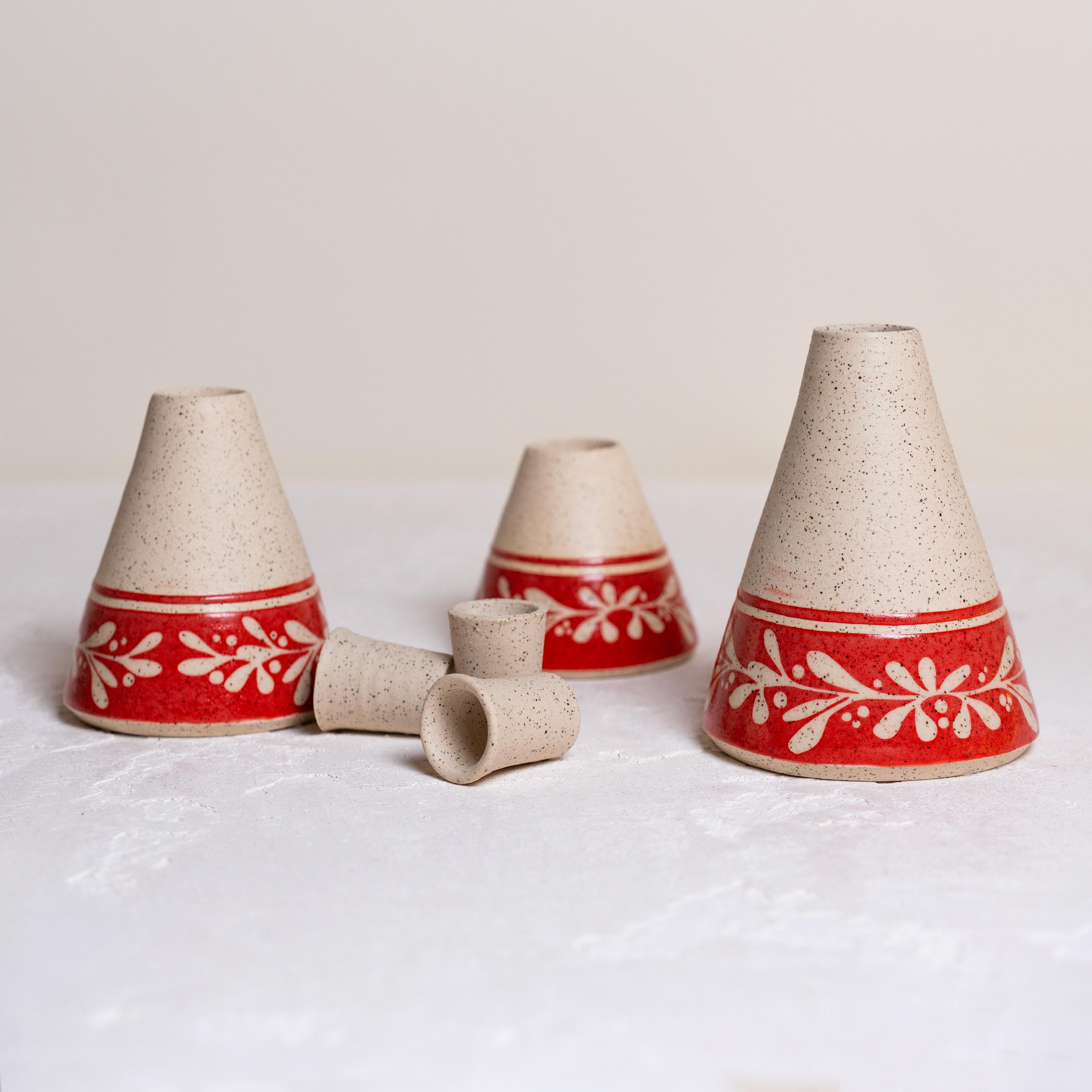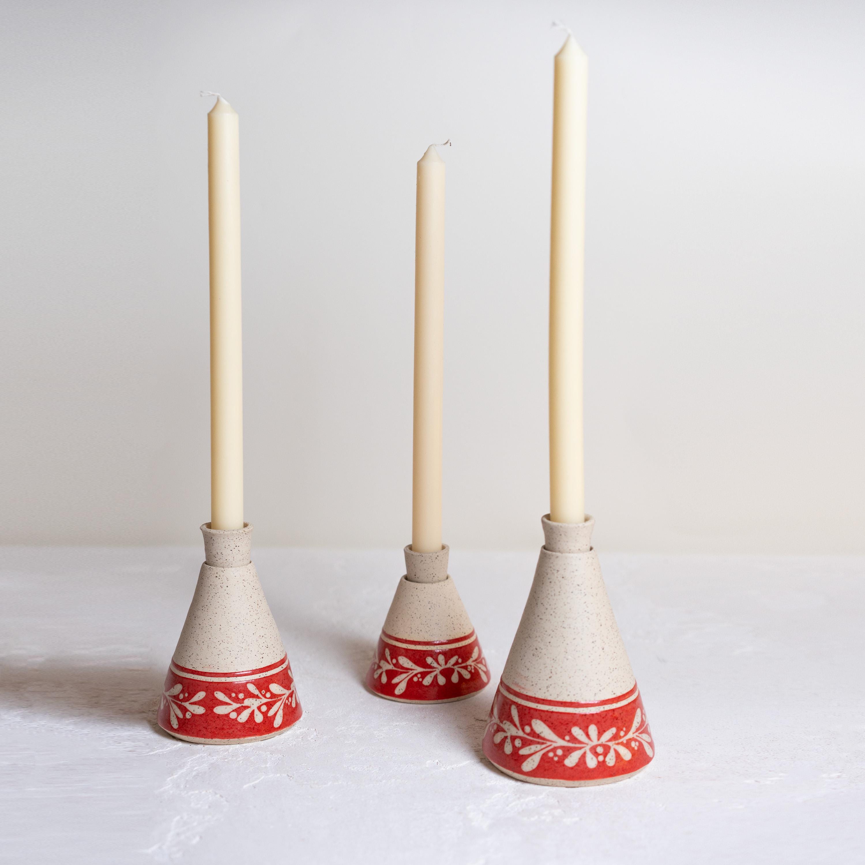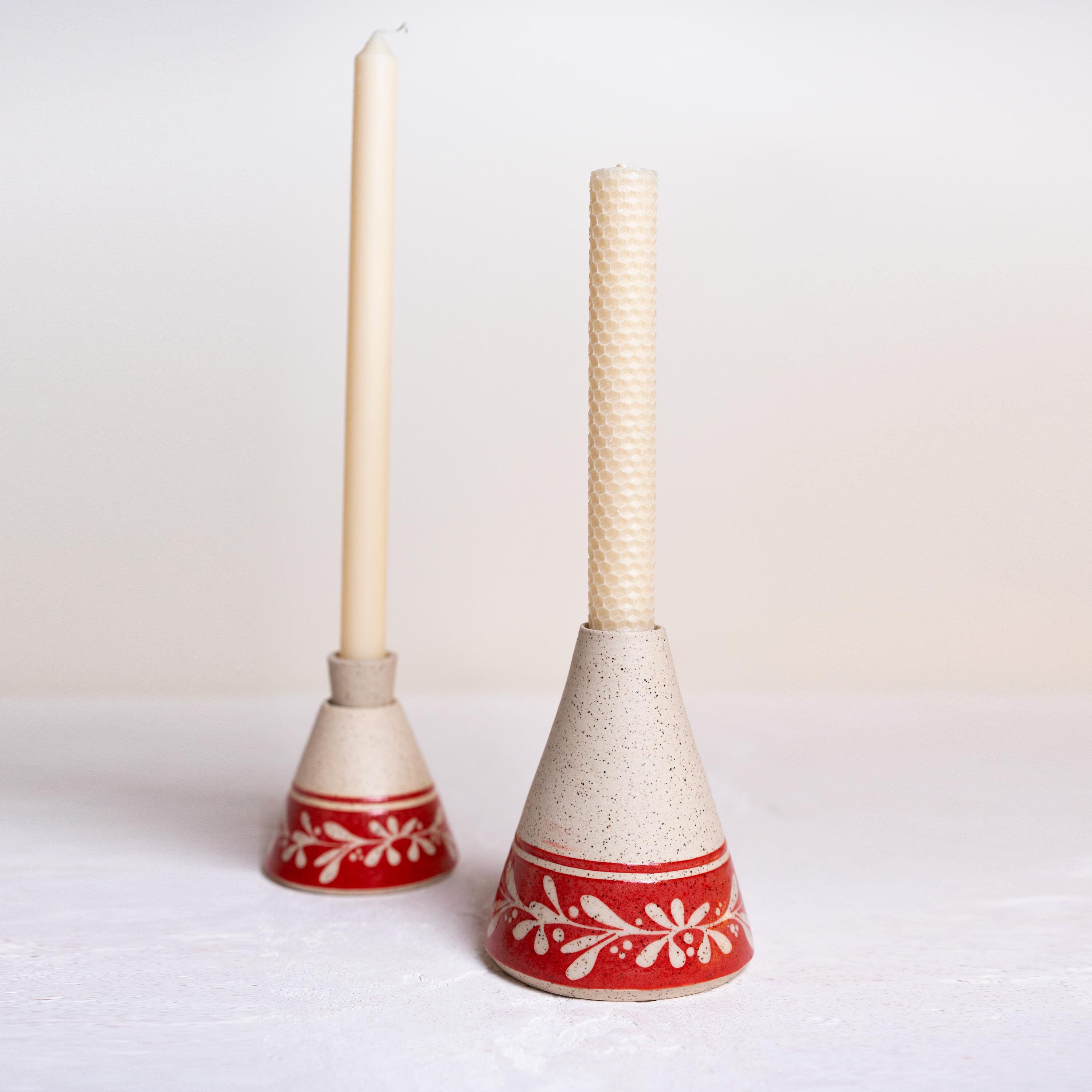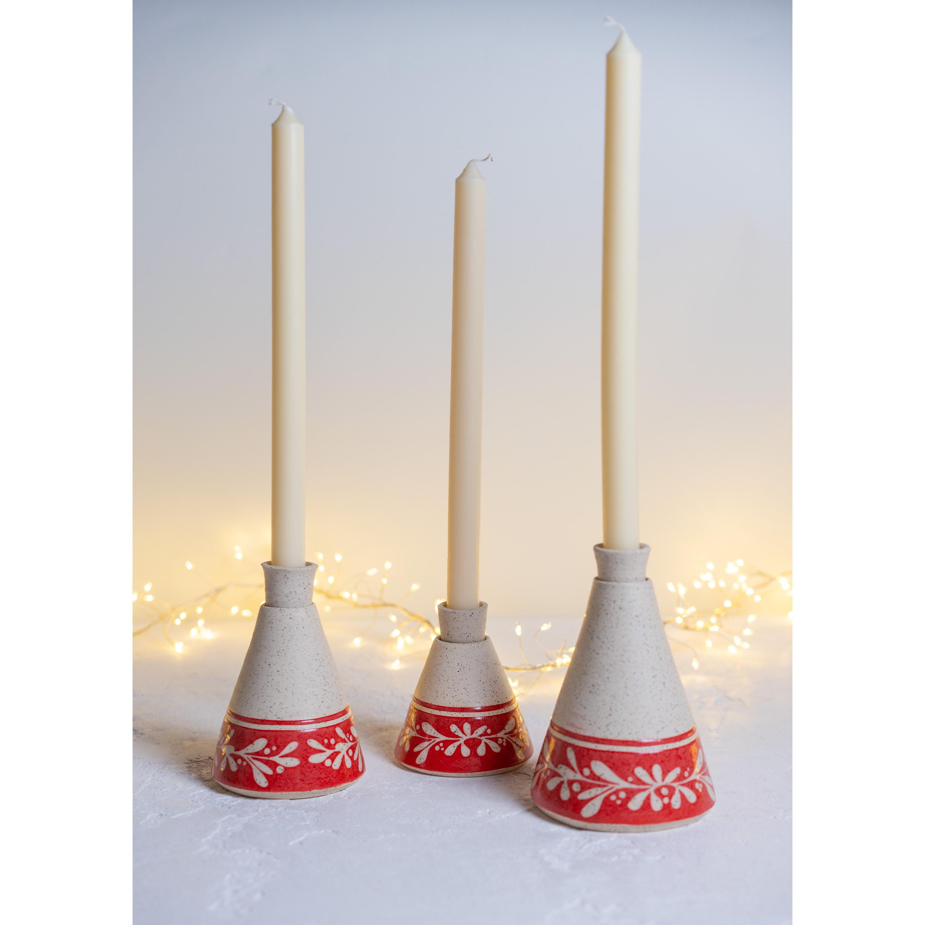 ABOUT THE SET This handcrafted set of stoneware candle holders is inspired by Nordic winter folk art. Each holder is shaped from durable speckled stoneware clay, hand-painted in a festive red-and-beige pattern. The design fits two candle sizes — traditional slim tapers and slightly wider holiday candles.