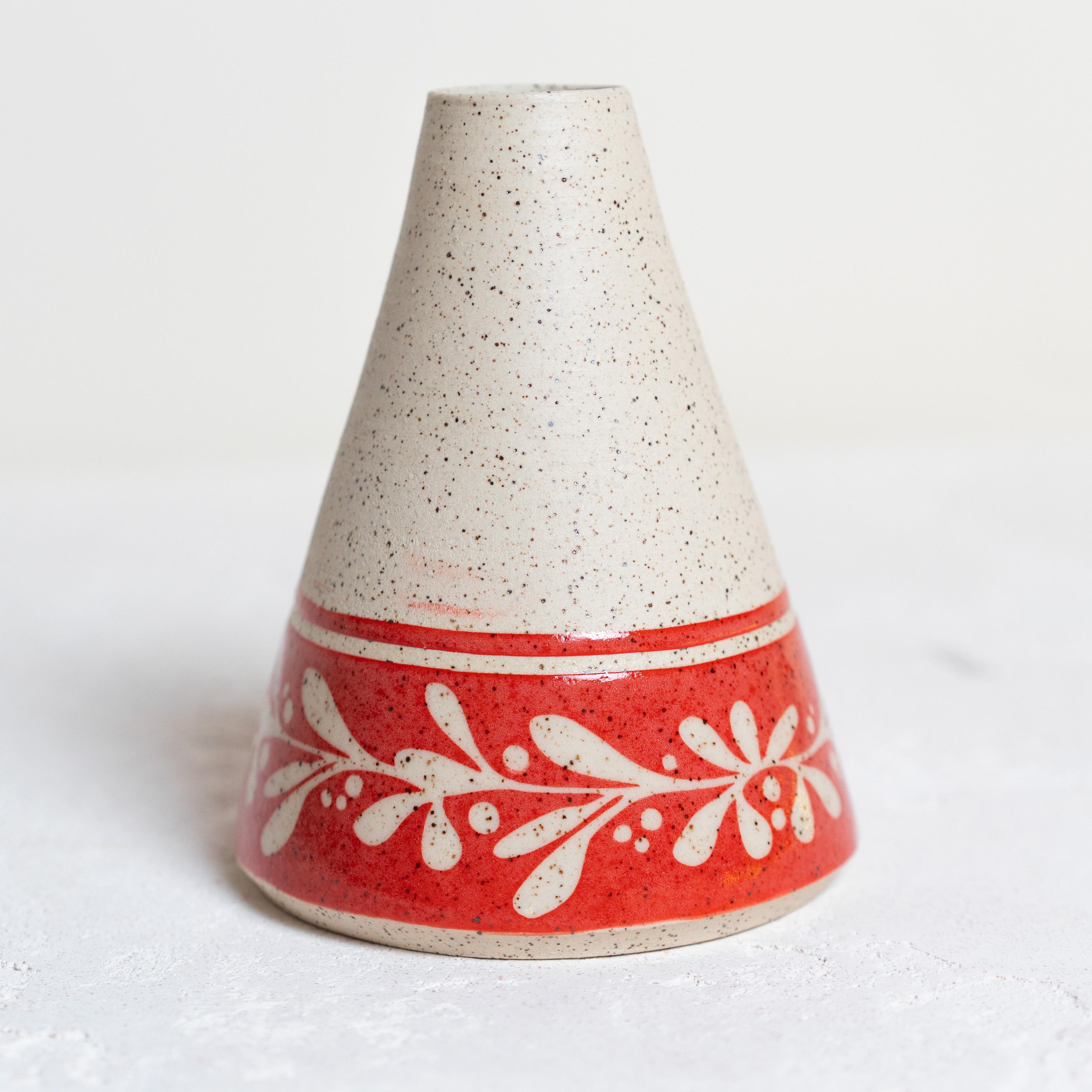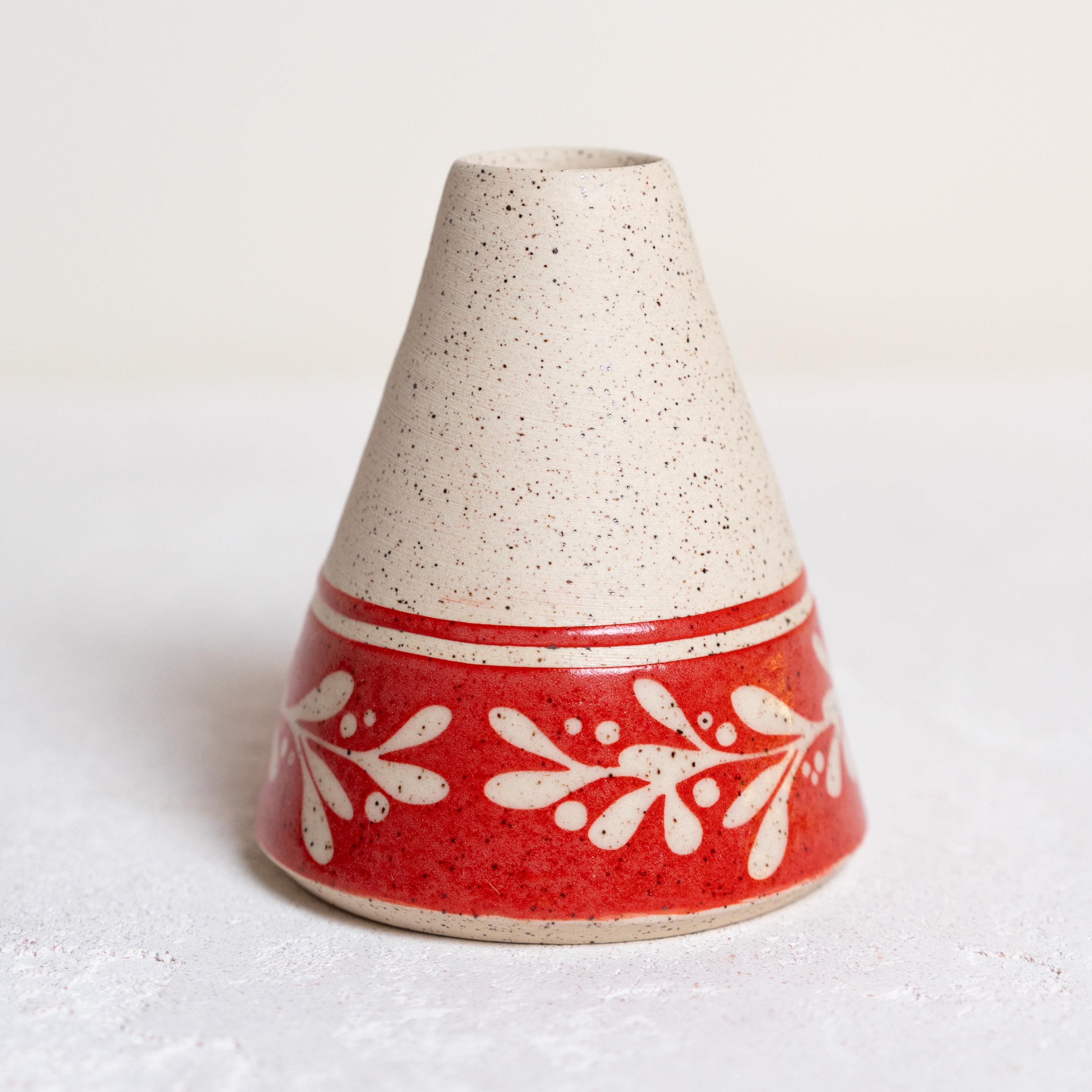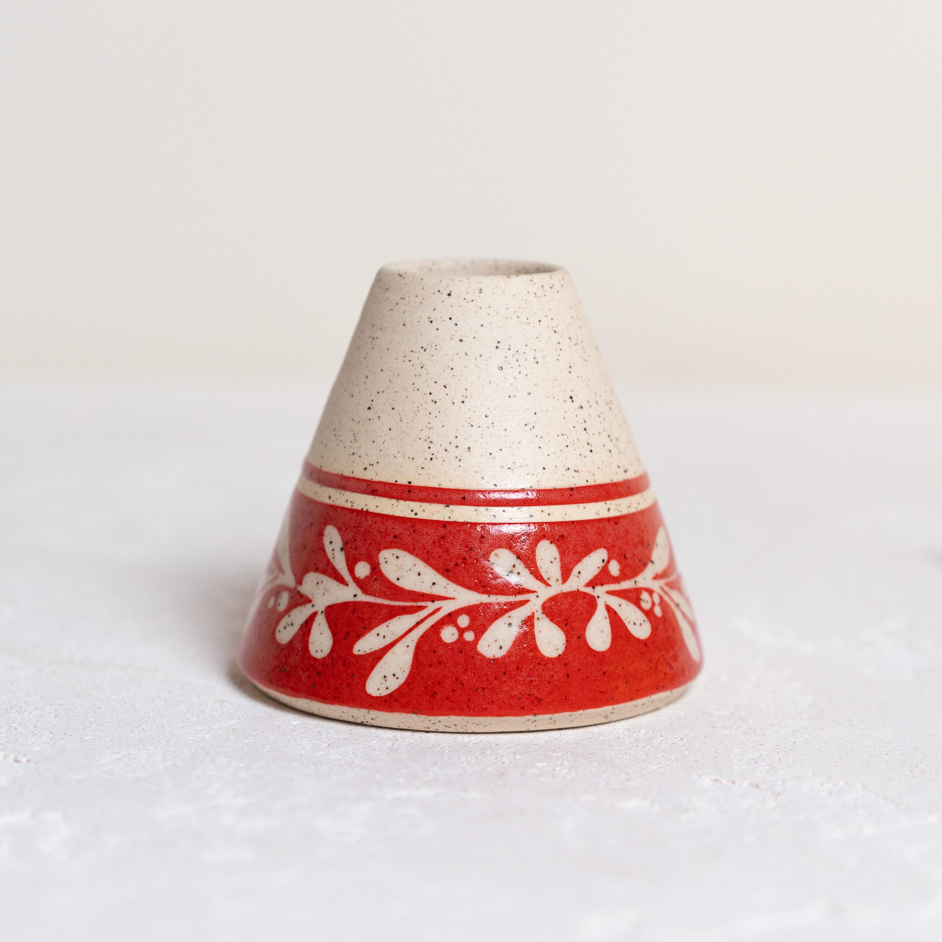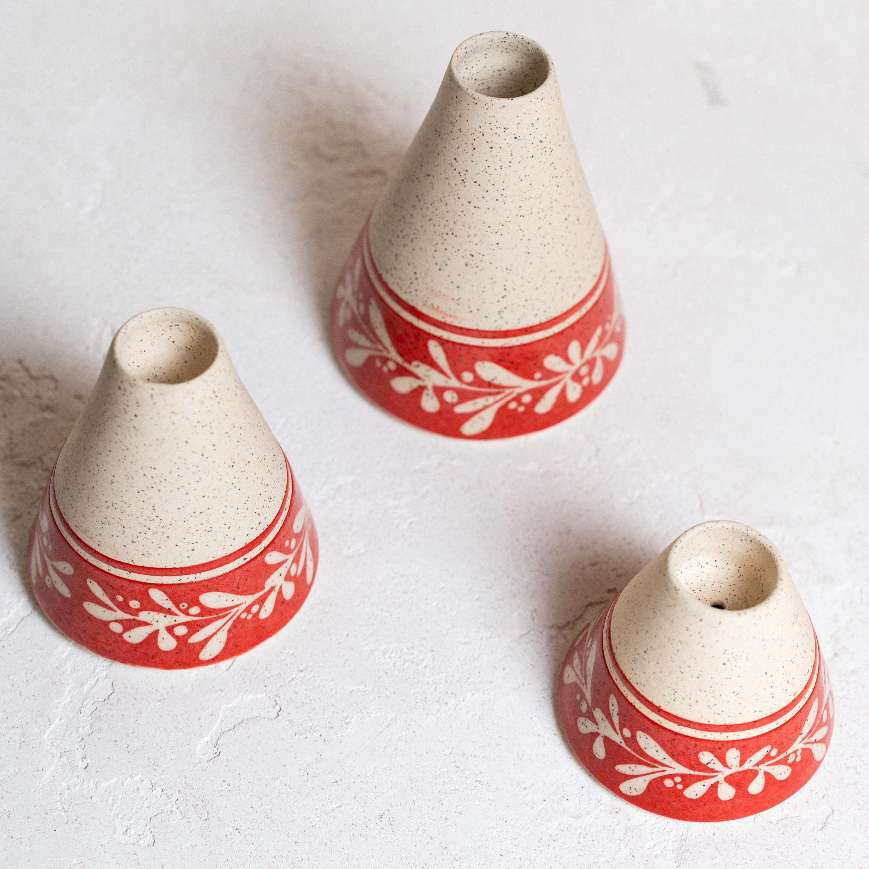 ABOUT THE SET This handcrafted set of stoneware candle holders is inspired by Nordic winter folk art. Each holder is shaped from durable speckled stoneware clay, hand-painted in a festive red-and-beige pattern. The design fits two candle sizes — traditional slim tapers and slightly wider holiday candles.